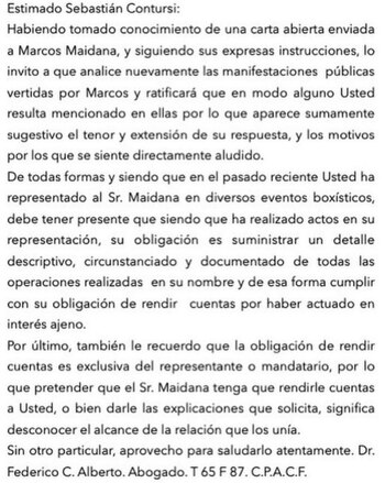 Aunque los asesores legales de Maidana anunciaron que no hubo una acusación hacia su persona, Contursi agregó: "Pues que diga de quién hablaba entonces. O, que al menos, asegure que no se trata de mí. No creo que tenga la decencia de hacerlo, pero nunca se sabe".