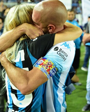 El grito común unido en el Dale Campeón se paralizó un instante cuando el referente, ídolo, capitán y máximo goleador de la Academia se separó del grupo para ir a abrazar a Mechi Blanco, la hija menor del presidente del club con la que tiene una relación especial.