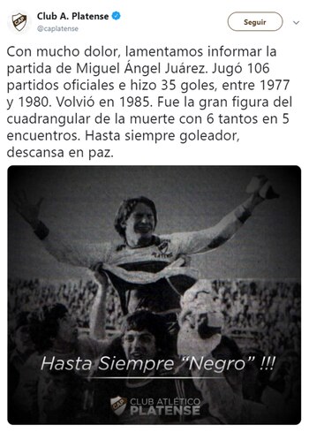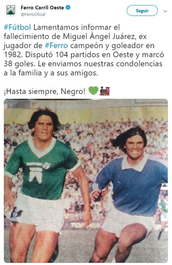 Miguel Ángel Juárez falleció anoche, a los 65 años de edad, luego de luchar con una enfermedad que contrajo hace algún tiempo. El rosarino fue campeón del Nacional 82 con Ferro Carril Oeste y se consagró goleador de ese torneo: celebró 22 tantos en 21 partidos.