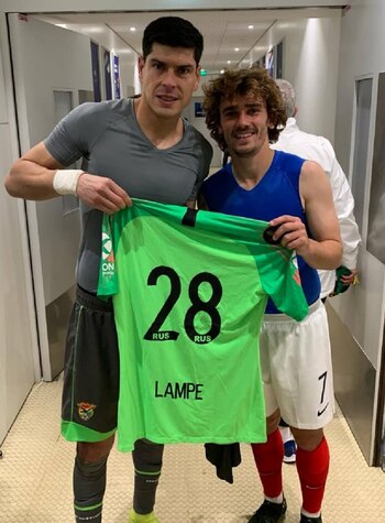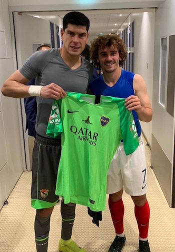 El encuentro entre la estrella que jugó la última temporada en el Atlético Madrid y el experimentado guardameta de San José se dio en el marco del partido amistoso que disputaron sus selecciones en el Stade de la Beaujoire – Louis Fonteneau de Nantes.