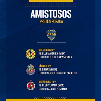 La tercera prueba será el miércoles 10 ante Xolos de Tijuana en el estadio Caliente mexicano. Tras la misma, el Xeneize emprenderá el regreso a Argentina. Desde allí quedarán dos semanas más para ajustar detalles de cara al estreno de la temporada, nada menos que por la ida de los octavos de final de la Libertadores ante Atlético Paranaense en Brasil (miércoles 24 de julio). Seguramente el debut en la Superliga sea el sábado 27, antes de definir la clasificación a cuartos de la Copa en la Bombonera (el miércoles 31).