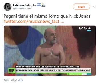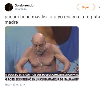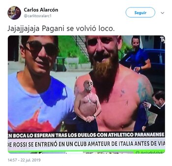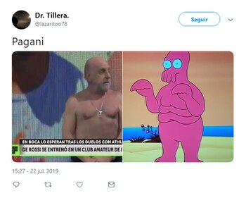 "Fijate si no hay foto de De Rossi mostrando lo que tiene abajo, porque también quiere sacarse los pantalones", bromeó Farinella, ante la sonrisa de Pagani. Más allá de sus análisis y de su defensa de una filosofía de juego, el periodista suele ser noticia cuando pierde los estribos en el fragor del debate. Esta vez, para criticar el arribo de De Rossi a Boca, se destapó como nunca antes. Y se transformó en tendencia en las redes sociales, que resultaron una usina de sentencias de admiración, burlas y memes por la ocurrencia de Horacio.