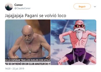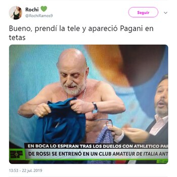 "¡¿Qué tiene de estado físico?! Es un tipo común, mirá la grasa que tiene en las tetas", refutó Pagani. "Sacate la camisa", lo desafió Marcelo Palacios, en el rol de conductor. Y el panelista, de 75 años, comenzó a quitarse primero la camisa, y luego la remera, ante el asombro y las risotadas de sus colegas en el estudio. "¡Vas a quedarte en cuero al aire!", reforzó sus movimientos Palacios.