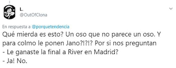 El Oso Jano quedó en el medio del fervor Superclásico… A menos de un mes de que River y Boca se crucen por primera vez luego de la final de la Copa Libertadores 2018 (el 1° de septiembre en el Monumental, por la Superliga), un peluche generó que el duelo entre los fanáticos en las redes sociales tuviera un pico de efervescencia.