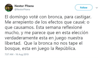 "El domingo voté con bronca, para castigar. Me arrepiento de los efectos que causé; o que causamos. Esta semana reflexioné mucho, y me parece que en esta elección verdaderamente esta en juego nuestra libertad. Que la bronca no nos tape el bosque, esta en juego la República", fue la reflexión que se publicó en el perfil @NestorPitana, quien en su biografía se define como "Misionero, árbitro FIFA y del Fútbol argentino. Ex-actor y ex-basquetbolista. Gran asador".