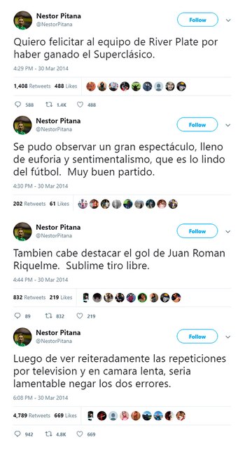 En 2014, luego de la acusación de Carlos Bianchi del ya famoso "Pitanazo" en La Bombonera que terminó con victoria de River sobre Boca por 2-1, los mensajes de la cuenta @NestorPitana se viralizaron. En ellos, el falso árbitro admitía dos errores que habían beneficiado al "Millonario".