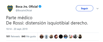 La lesión de De Rossi genera preocupación debido a que aún no se informaron los plazos exactos de recuperación y a que en diez días Boca afrontará el primer Superclásico ante River por la ida de las semifinales de la Copa Libertadores. El duelo ante los Millonarios será el 1° de octubre en el estadio Monumental y es una incógnita si el ex Roma podrá estar presente.