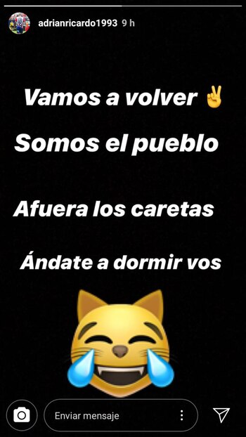 Para las PASO, Centurión también había celebrado el triunfo del Frente de Todos con una burla contra el oficialismo. “Vamos a volver, somos el pueblo, afuera los caretas, andate a dormir vos”, escribió el jugador de Atlético San Luis de México en una Story de Instagram, junto a un emoji de una manos con los dedos en "V" y de un gato con lágrimas.