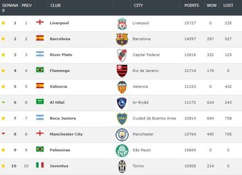 En cuanto al ranking de clubes, River figura en el tercer puesto detrás del Liverpool y el Barcelona. El Millonario suma 12.816, mientras que Boca es el otro club argentino que aparece en el top ten, en la séptima colocación. El sistema de puntuación se basa en los resultados de las últimas 52 semanas.