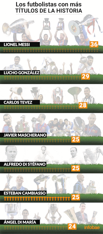 Los argentinos ya retirados que pertenecen a esta selecta nómina son Alfredo Di Stéfano y Esteban Cambiasso, que ostentan 25 títulos. Otros de los que todavía están vigentes son Javier Mascherano (35 años, hoy en Estudiantes de La Plata), con 25 títulos, y Ángel Di María (32 años), figura del Paris Saint Germain, quien cierra la lista con 24 trofeos.