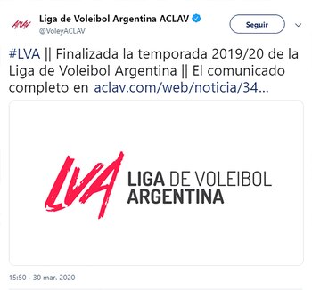 Mientras otras disciplinas aguardan por la evolución de la pandemia en Argentina para definir cómo continuarán sus competencias (como el fútbol), un deporte dio el paso al frente y se transformó en el primer en declarar desierto su torneo por la crisis desatada por el coronavirus. “La Asociación de Clubes Liga Argentina de Voleibol y los cuatro clubes que clasificaron a semifinales tomaron este lunes 30 de marzo la decisión conjunta de dar por finalizada la Liga de Voleibol Argentina temporada 2019/2020, en el marco de la situación sanitaria en Argentina por la pandemia de COVID-19”, informó la ACLAV mediante un comunicado que difundió a través de sus redes sociales.