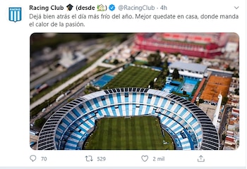 “Dejá bien atrás el día más frío del año. Mejor quedate en casa, donde manda el calor de la pasión”, escribió la Academia de manera ingeniosa en su cuenta oficial de Twitter. Claro que la frase fue acompañada con una imagen del Cilindro en la que “bien atrás” se alcanza a ver la fachada del Libertadores de América.