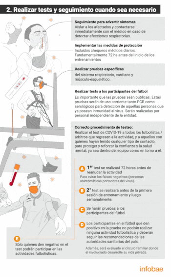 Una vez realizadas las pruebas, quienes den positivos serán aislados y será evaluado el círculo familiar donde el involucrado desarrolle su vida privada, mientras quienes den negativo podrán participar de las actividades futbolísticas. Sumado a esto, serán implementados diariamente los controles de temperatura, del sistema respiratorio, cardíaco, músculo-esquelético y trastornos en el olfato como medidas de protección.