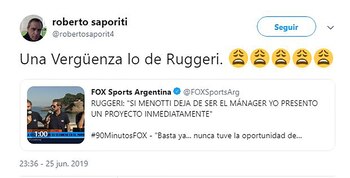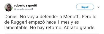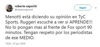 "Menotti está diciendo su opinión en TYC Sports. Ruggeri escuche a ver si APRENDE!!! No lo pongan más al frente de Fox Sports 90 minutos. Tengan respeto por los periodistas de ese MEDIO", continuó Saporiti, quien cerró con un comentario directo hacia otro periodista: "Daniel. No voy a defender a Menotti, pero lo de Ruggeri empezó hace 1 mes y es lamentable. No hay retorno. Abrazo grande".
