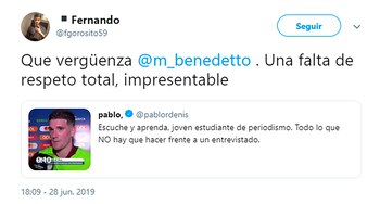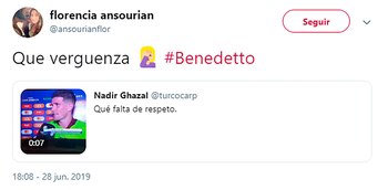 La incómoda situación descolocó al futbolista, pasó inadvertida en ese momento para el propio Benedetto y se transformó en una tendencia en las redes sociales. Las críticas sobre el especialista aparecieron una tras otra y convirtieron el apellido del periodista en una de las tendencias.