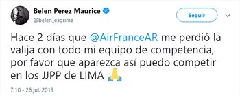 "Hace 2 días que @AirFranceAR me perdió la valija con todo mi equipo de competencia, por favor que aparezca así puedo competir en los JJPP de LIMA", escribió Pérez Maurice en su cuenta de Twitter. El mensaje se viralizó en las redes sociales; sin embargo, el reclamo de la deportista aún no ha tenido una resolución satisfactoria.