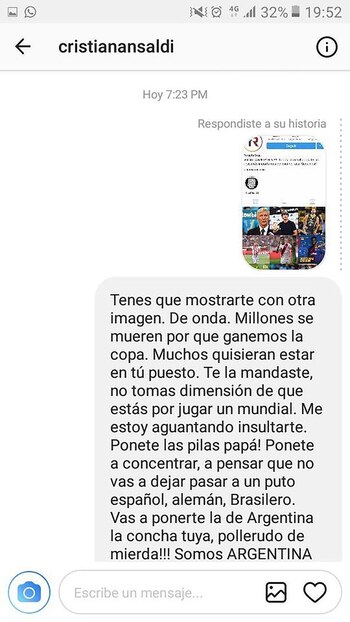 "Tenés que mostrarte con otra imagen. De onda. Millones se mueren porque ganemos la copa. Muchos quisieran estar en tu puesto. Te la mandaste, no tomás dimensión de que estás por jugar un Mundial. Me estoy aguantando insultarte. Ponete las pilas papá! Ponete a concentrar, a pensar que no vas a dejar pasar a un puto español, alemán, brasilero. Vas a ponerte la de Argentina la concha tuya, pollerudo de mierda!!! Somos Argentina forro!!".