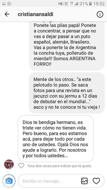 Y no conforme con eso, el hincha albiceleste continuó: "Mente de los otros… 'a este pelotudo lo paso. Se saca fotos para una revista en un jacuzzi con su jermu a 12 días de debutar en el mundial…' asco y no te conoce ni tu vieja!".