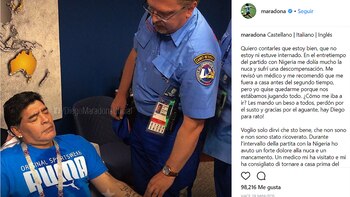 "Quiero contarles que estoy bien, que no estoy ni estuve internado. En el entretiempo del partido con Nigeria me dolía mucho la nuca y sufrí una descompensación. Me revisó un médico y me recomendó que me fuera a casa antes del segundo tiempo, pero yo quise quedarme porque nos estábamos jugando todo. ¿Cómo me iba a ir? Les mando un beso a todos, perdón por el susto y gracias por el aguante, hay Diego para rato!".