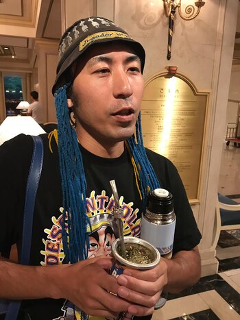 Isamu Kato estaba con su gorro "xeneize", el mismo que tenía estampadas todas las Copas Libertadores que ganó el club de la ribera y que lleva una inscripción en la frente: "Jugador número 12". Vestido con una remera y un pantalón auriazul, portaba su inseparable termo con el mate y los colores azul y oro, al estilo bien argentino.