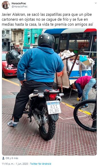 “Esto fue el sábado. A la mañana me habían dado el alta médica por un problema en los pulmones por el que había quedado internado. Volví a mi casa y fui con mi hijo a comprar unos remedio a la farmacia, sobre las calles Rivadavia y Carabobo. Mientras mi hijo entró al local, yo me quedé esperándolo en la moto y veo a un chiquito empujando el carro con una ojota rota y la otra a mal traer. Cuando llegó hasta donde estaba yo le pregunté cuánto calzaba y me dijo 40. Ahí me bajé y le di mis zapatillas. Se me quedó mirando y le dije que eran de él. Se las puso, me miró con una cara de feliz cumpleaños tremenda... Me agradeció un montón y se fue con una polenta tremenda”, describe el momento Javier Alakran frente a Infobae.