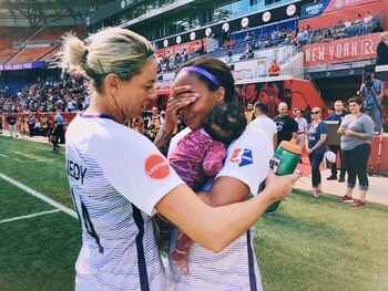En las redes sociales, Leorux publicó una foto de los minutos posteriores al partido en la que se la ve con la indumentaria de Orlando Pride, cargando a su pequeña hija dentro del campo de juego.