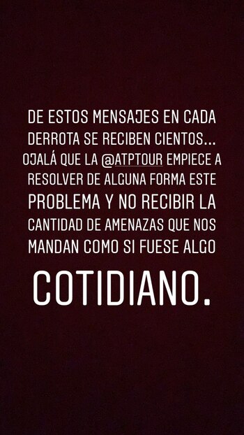 “Quiero denunciar a esta persona que en cada partido me insulta y amenaza”, escribió el tenista en una de sus historias y continuó sus posteos con algunos ejemplos de las agresiones que recibe en la red social. “De estos mensajes en cada derrota se reciben cientos... Ojalá que la ATP empiece a resolver de alguna forma este problema y no recibir la cantidad de amenazas que nos mandan como si fuese algo cotidiano”, solicitó el singlista. Desde su círculo más cercano entienden que ese tipo de mensajes intimidantes podrían ser emitidos desde un sector vinculado a la mafia de las apuestas ilegales.