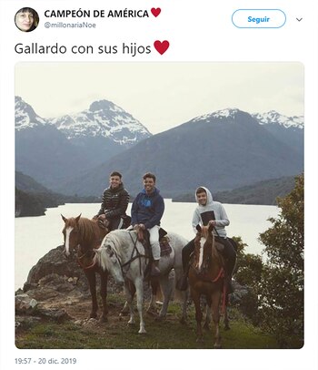 En las últimas horas se supo qué lugar eligió Gallardo para pasar sus días de descanso. El entrenador está en Bariloche (Río Negro) junto a dos de sus hijos: Matías y Santino. Justamente fue Matías, que juega en la sexta categoría del club de Núñez, el que compartió una imagen de una cabalgata por las montañas. Cabe recordar que el DT también es padre de Nahuel (que integra el plantel profesional de River) y de Benjamín Keanu (que nació en julio de este año).