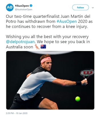 “Juan Martín del Potro, que llegó dos veces a cuartos de final en este torneo, se ha bajado del Abierto de Australia 2020 mientras continúa recuperándose de la lesión en su rodilla. Te deseamos lo mejor con tu recuperación y esperamos verte de vuelta en Australia pronto”, reza el comunicado difundido a través de la cuenta de Twitter del certamen.