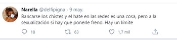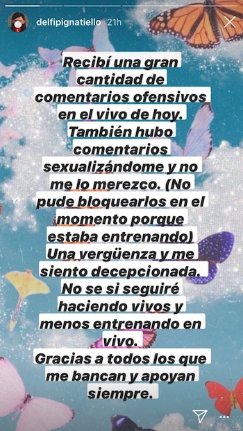La atleta dejó en claro que este tipo de agresiones y de comentarios no solicitados sobre su cuerpo podrían alejarla de uno de sus hobbies, que es contactarse con sus seguidores a través de las redes. Su popularidad y su visibilidad no la eximen de las ofensas que suelen recibir las mujeres en diferentes ámbitos y que, muchas veces, las obligan a cambiar sus hábitos o incluso a dejar actividades que les resultan agradables. Sin embargo, ‘Delfi’ pudo alzar su voz y señalar públicamente el hecho, lo que motivó muchas muestras de apoyo de parte de su seguidores.