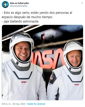Quienes siguieron el histórico evento desde Argentina detectaron un parecido que generó una catarata de memes en las redes sociales. Bob Behnken, uno de los astronautas, junto a Doug Hurley, elegidos para la misión, resultó un clon de Marcelo Gallardo. Y ese link se viralizó durante las jornadas de ayer y hoy.