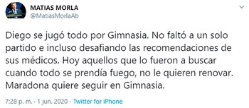 En ese tira y afloje, las diferencias afloraron en la publicación de Morla. Diego sigue las alternativas desde su casa en Bella Vista; durante la cuarentena se había mostrado activo monitoreando los trabajos del plantel vía Zoom y se había comunicado con los jugadores de manera individual para enterarse de primera mano cómo sobrellevaban el aislamiento ante la pandemia de COVID-19.