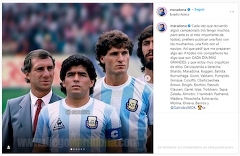 ¿Un festejo de gol? ¿El astro con el trofeo elevado? ¿Un grito sagrado? No. “Cada vez que recuerdo algún campeonato (no tengo muchos, pero este es el más importante de todos), prefiero publicar una foto con los muchachos, una foto con el equipo”, subrayó Maradona, con perfil de capitán hasta en el momento de sumergirse en el mundo de las redes sociales.