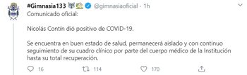 “Nicolás Contín dio positivo de COVID-19. Se encuentra en buen estado de salud, permanecerá aislado y con continuo seguimiento de su cuadro clínico por parte del cuerpo médico de la Institución hasta su total recuperación”, publicó Gimnasia este viernes en su cuenta de Twitter. En el mismo informe se detalló que al jugador se le hizo el hisopado el jueves por la mañana, luego de que manifestara la pérdida del gusto y del olfato. Por este motivo también fue aislado de manera preventiva el futbolista Eric Ramírez, quien compartió el auto con Contín en el viaje hacia el estadio de San Lorenzo.