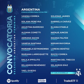 La lista inicial que dio Borrello sufrió algunos cambios. En principio, estaba incluida Micaela Cabrera, pero la delantera de Boca debió ser desafectada por lesión. En su lugar ingresó la joven atacante de River Martina del Trecco. También se sumó la mediocampista de Gimnasia La Plata Milagros Díaz.