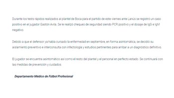 El departamento médico de la institución de la Ribera lo confirmó a través de un comunicado: Durante los tests rápidos realizados al plantel de Boca para el partido de este viernes ante Lanús se registró un caso positivo en el jugador Gastón Avila. Se le realizó chequeo de seguridad siendo PCR positivo y el dosaje de IgG e IgM negativo. Debido a que el defensor ya había cursado la enfermedad en septiembre, en forma asintomática, se decidió su aislamiento preventivo e interconsulta con infectología y estudios pertinentes para arribar a un diagnóstico definitivo. El jugador se encuentra asintomático así como el resto del plantel y el personal en perfecto estado. Se continuará con las medidas de prevención y cuidados”.