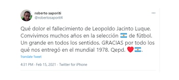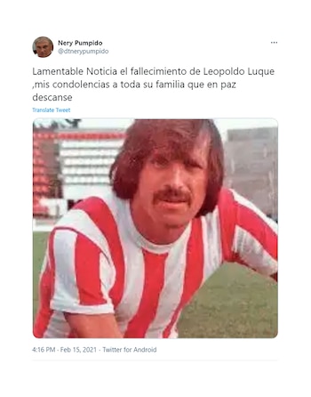 Nery Alberto Pumpido, arquero de la selección campeona mundial en México 1986, escribió en Twitter: “Lamentable noticia el fallecimiento de Leopoldo Luque, mis condolencias a toda su familia y que en paz descanse”.