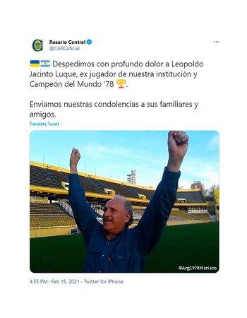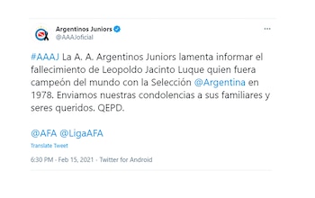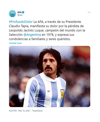 La Asociación del Fútbol Argentino también despidió a Luque. “La AFA, a través de su Presidente Claudio Tapia, manifiesta su dolor por la pérdida de Leopoldo Jacinto Luque, campeón del mundo con la Selección en 1978, y expresa sus condolencias a familiares y seres queridos”.