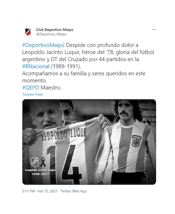 River Plate, el club donde brilló Leopoldo Luque, lo homenajeó de la siguiente manera: “Despedimos con profundo dolor a Leopoldo Jacinto Luque, figura histórica de nuestro Club, héroe del 78 y gloria del fútbol argentino. Hasta siempre, campeón del Mundo.