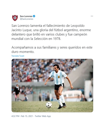 El mensaje del Club San Lorenzo de Almagro: “San Lorenzo lamenta el fallecimiento de Leopoldo Jacinto Luque, una gloria del fútbol argentino, enorme delantero que brilló en varios clubes y fue campeón mundial con la Selección en 1978. Acompañamos a sus familiares y seres queridos en este duro momento”.