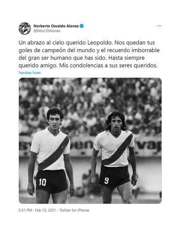 Ubaldo Fillol también eligió su cuenta de Twitter para dedicarle sentidas palabras a su amigo. “Hasta siempre, querido amigo Leopoldo. Se fue una gran persona, un compañero formidable y un jugador excepcional. Fuiste un ejemplo para todo el plantel en el 78. Gracias por lo que le diste al fútbol argentino. Abrazo del alma para toda su familia. Te vamos a extrañar”.