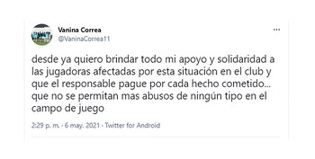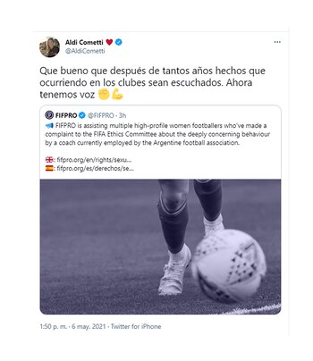Casi al mismo tiempo dos referentes de la selección argentina como la defensora Aldana Cometti y la arquera y capitana Vanina Correa expresaron su apoyo a la dirigencia de la AFA. “Desde ya quiero brindar todo mi apoyo y solidaridad a las jugadoras afectadas por esta situación en el club y que el responsable pague por cada hecho cometido... que no se permitan mas abusos de ningún tipo en el campo de juego”, escribió Correa, arquera del Espanyol de Barcelona.