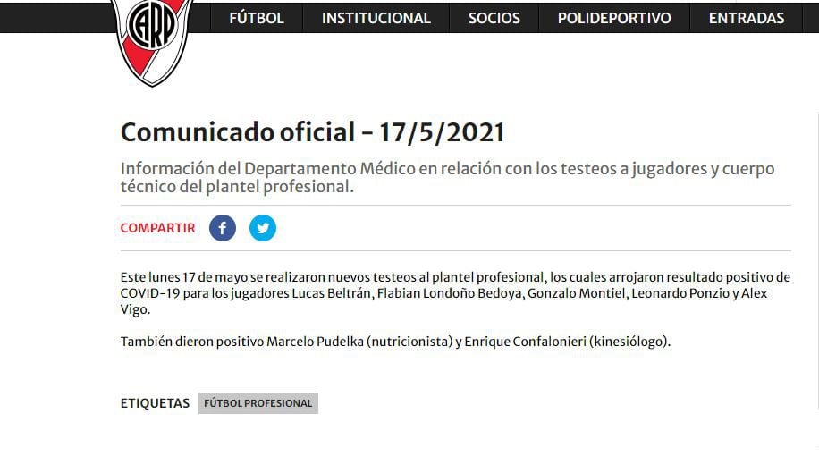 Parte de los puntos tratados en el cónclave fueron informados mediante un comunicado que dio a conocer la institución de Núñez. En el texto, que se publicó pasada la medianoche del lunes, se expresa “que pese a haber cumplido con todos los protocolos” el club River Plate “tiene 25 casos positivos de coronavirus”. En este sentido, remarca en el escrito que “no alcanzó con diseñar procesos específicos y ampliar cuidados para evitar un espiral de contagios de esta naturaleza”.