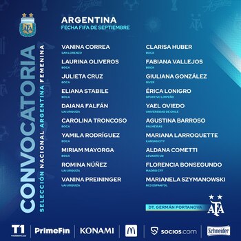 En su primera convocatoria oficial, Portanova citó a 20 jugadoras. 13 de ellas son de equipos del torneo local (Boca fue el conjunto que más aportó, con ocho), mientras que las siete restantes provienen de clubes del exterior de países como Paraguay, Chile, Brasil, Estados Unidos y España. Entre las integrantes de la nómina se destaca el nombre de Florencia Bonsegundo, quien hará su regreso a la Selección luego de más de dos años de ausencia (su última aparición fue en el Mundial de Francia 2019).