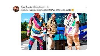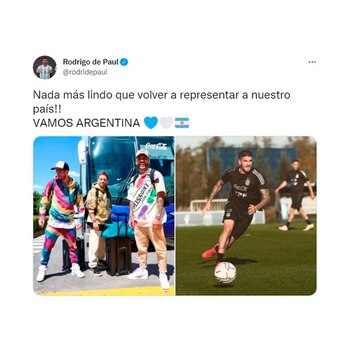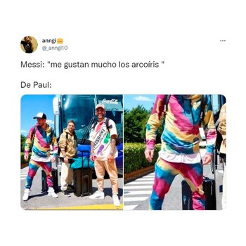 De Paul fue tendencia por su particular atuendo. Con un pantalón y un buzo de arcoiris provocó una catarata de memes, muchos de ellos relacionados a la gran amistad entablada con Lionel Messi. Rodrigo se sumó desde Europa junto con Papu Gómez y Otamendi a la delegación argentina que afrontará una nueva triple fecha de Eliminatorias Sudamericanas con rumbo al Mundial de Qatar 2022.