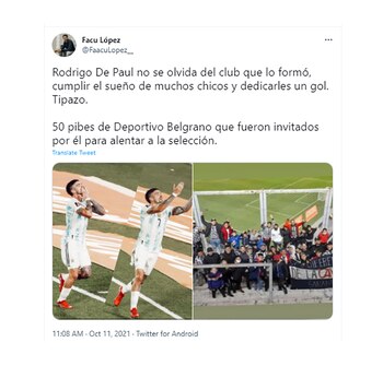 En el festejo de su tanto, De Paul no dudó en repartir besos hacia las cabeceras del Monumental. No fue un episodio improvisado, es que el mediocampista le cumplió el sueño a los niños que juegan al fútbol en Deportivo Belgrano, el club donde se inició, con el regalo de entradas para que pudieran ver el espectáculo ante La Celeste en el Antonio Vespucio Liberti.