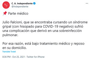“Julio Falcioni, que se encontraba cursando un síndrome gripal, sufrió una complicación que derivó en una sobreinfección pulmonar. Por esa razón, está bajo tratamiento médico y reposo en su domicilio”, dice el parte médico que publicó Independiente en sus redes sociales. Cabe recordar que en 2018 el Emperador tuvo cáncer de laringe y pudo recuperarse.