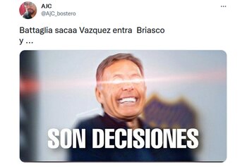 Sin embargo, la inventiva de los hinchas no estuvo solamente enfocada en estas explosivas declaraciones del director técnico del Bicho. También hubo un amplio espacio dirigido al cambio que realizó Sebastián Battaglia cuando faltaban poco más de 20 minutos para el cierre del partido: sacó el goleador Luis Vázquez, autor del único tanto, y envió a la cancha a Norberto Briasco en su lugar.