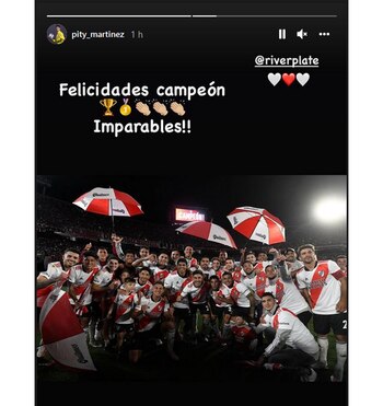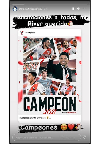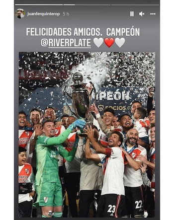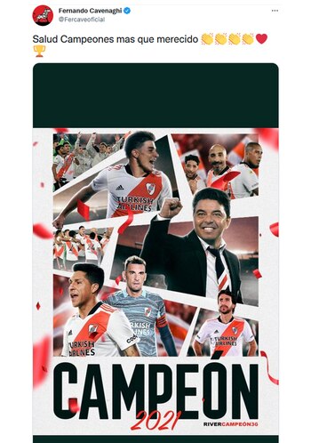 Como siempre, Fernando Cavenaghi también estuvo al pie del cañón a la hora de felicitar a sus ex compañeros. “Salud Campeones mas que merecido”, envió el histórico goleador del club. Gonzalo Martínez y Juan Fernando Quintero también subieron distintas fotos de los festejos y el Pity describió al equipo como “imparable” mientras que el colombiano fue más genérico con varios emojis blancos y rojos luego de vincular a su futuro con una posible vuelta a la institución.