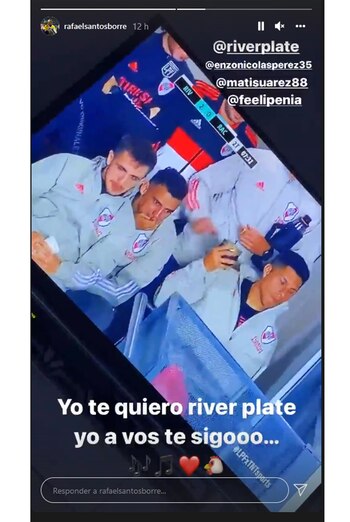 A continuación, dos delanteros que actualmente juegan en la Bundesliga de Alemania también se mantuvieron despiertos en la madrugada europea para ver el título de River. “Felicitaciones por el titulo River Plate. Saludo grande a toda su gente”, escribió Lucas Alario y lo siguió Rafael Santos Borré con una foto a su computadora mientras miraba el partido en la oscuridad cuando la cámara enfocó a Enzo Pérez, Matías Suárez y Felipe Peña: “Yo te quiero River Plate, yo a vos te sigooo...”.